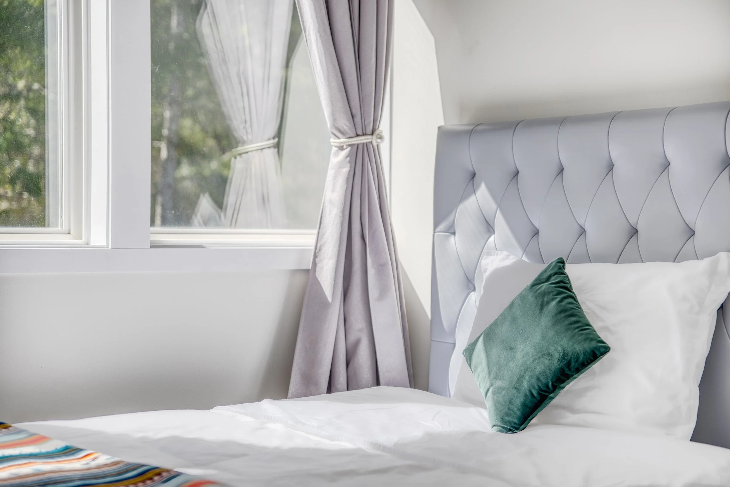 Bright Nanaimo Airbnb bedroom with soft lavender natural light, modern design captured by professional photographer for real estate and rental marketing.