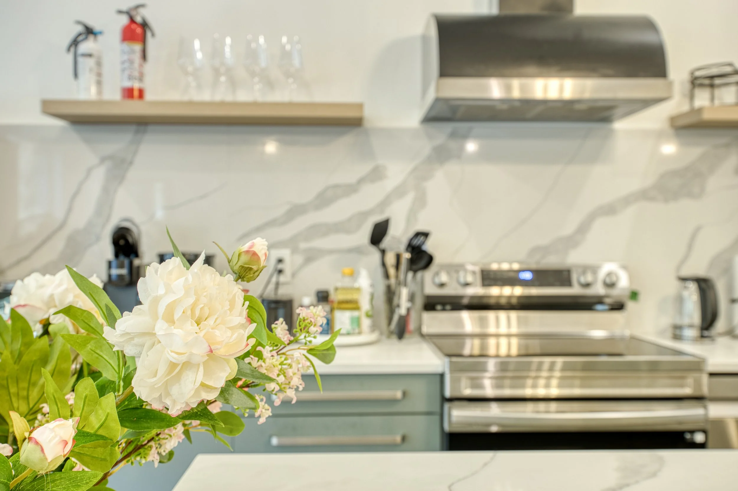 Airbnb dining room in Nanaimo with complete kitchen setup, fresh flowers, and modern décor, photographed for real estate and property rental listings.