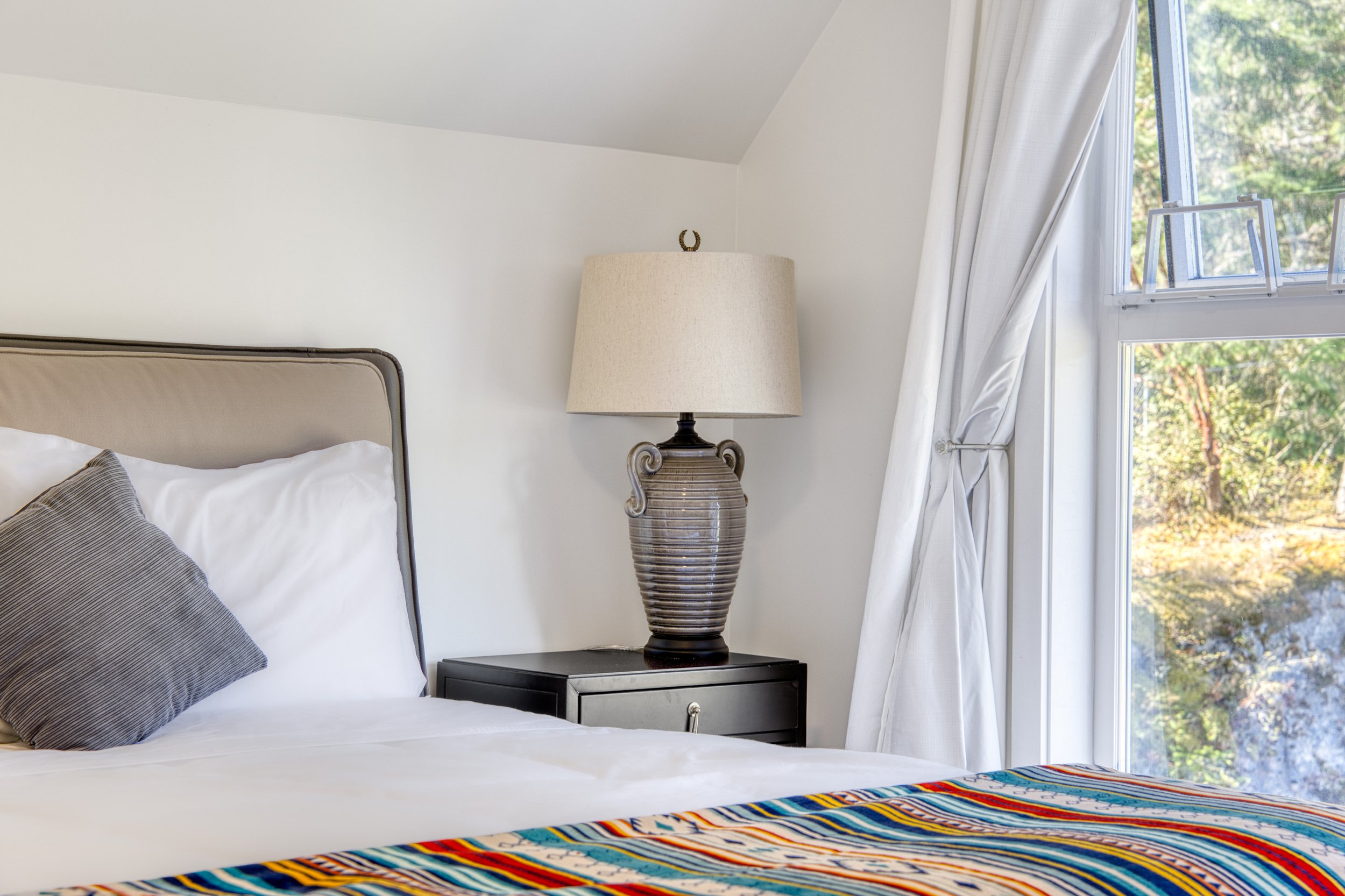 Minimalist Airbnb bedroom in Nanaimo, clean and tidy with fresh white linens, professional photography for real estate and vacation rental marketing.